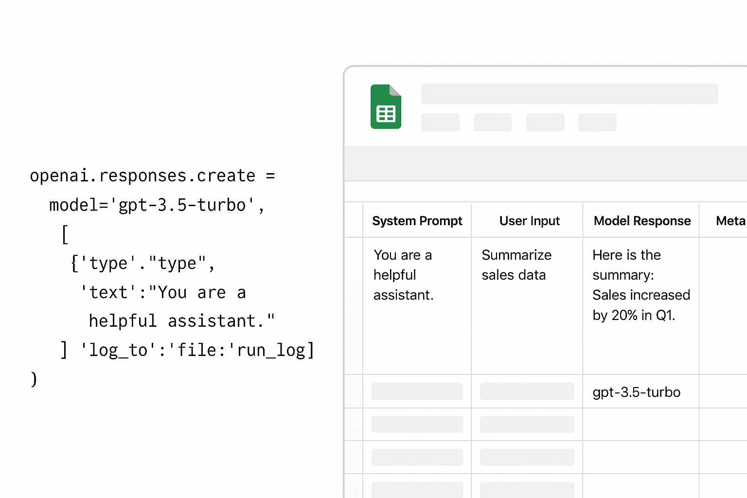 Log full prompt workflows — system prompt, user input, model response and metadata — directly into Google Sheets. Monitor reuse of prompts at a glance.